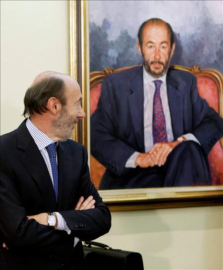 Otra imagen cargada de simbolismo. El hombre fuerte del nuevo Gobierno de Zapatero y el que más poder ha acumulado en democracia, Pérez Rubalcaba, mira orgulloso un retrato suyo. EFE