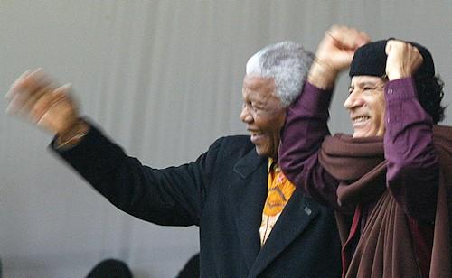 Gadafi con el primer presidente de Sudáfrica, Nelson Mandela