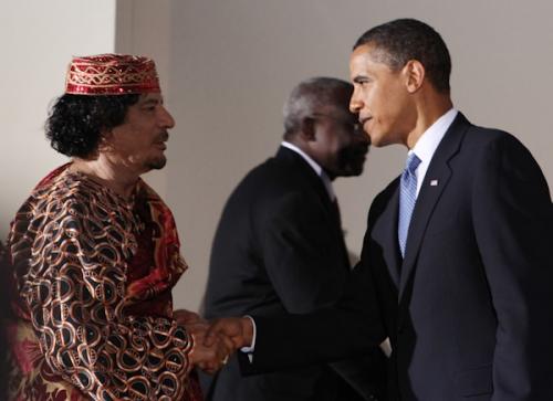 El dictador libio es muy amigo del presidente venezolano. El 28 de septiembre de 2009, Hugo Chávez le entregó una réplica de la Espada del Perú, que la Municipalidad de Lima (Perú), regaló a Simón Bolívar en 1825, y recibió la Orden del Libertador