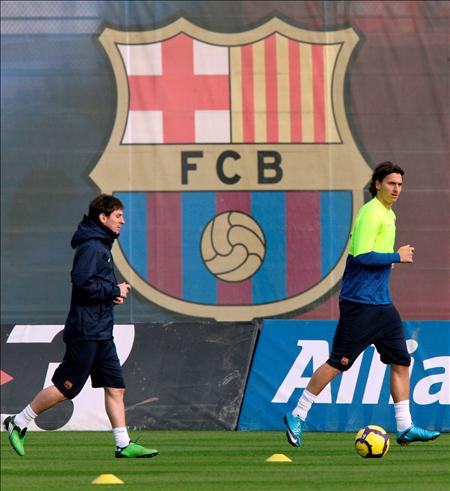 Los delanteros del FC Barcelona, el sueco Zatlan Ibrahimovic y el argentino Leo Messi, durante el entrenamiento realizado esta mañana en las instalaciones de la ciudad deportiva del club, de cara al partido de la Liga de fútbol que jugarán este próximo domingo en el Camp Nou frente al Real Madrid. EFE/ Andreu Dalmau