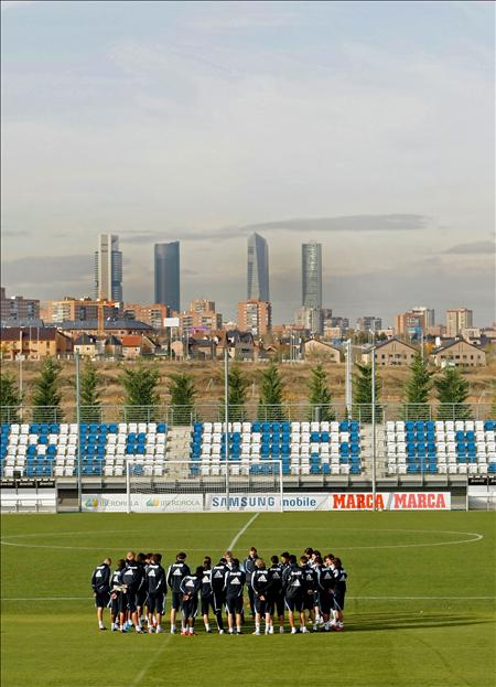 La plantilla del Real Madrid, durante el entrenamiento que realizó hoy en la ciudad deportiva de Valdebebas, de cara al partido que disputará el próximo domingo contra el FC Barcelona en el Camp Nou. EFE/Ballesteros