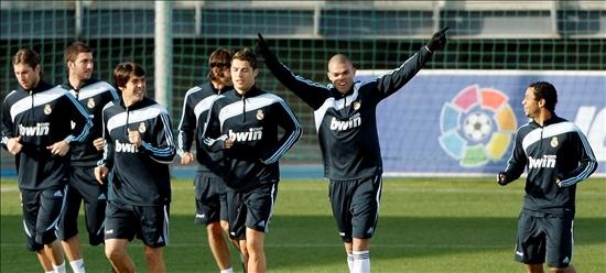 Los jugadores del Real Madrid, durante el entrenamiento que realizó hoy la plantilla en la ciudad deportiva de Valdebebas, de cara al partido que disputará el próximo domingo contra el FC Barcelona en el Camp Nou. EFE/Ballesteros