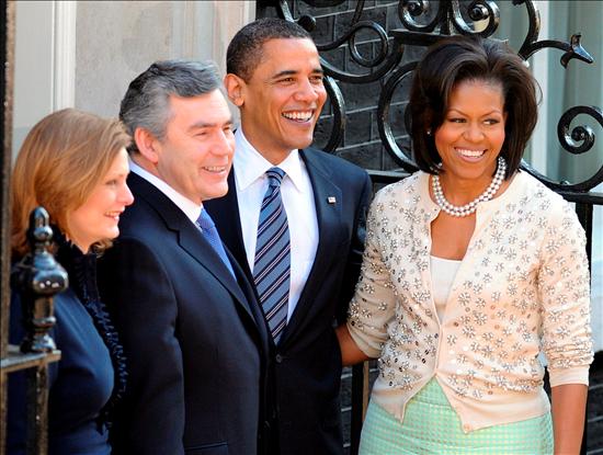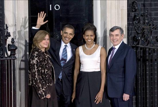 La esposa del primer ministro británico, Sarah Brown; el primer ministro británico; el presidente de Estados Unidos, Barack Obama, y su esposa, Michelle Obama, posan antes de su reunión en Downing Street, Londres. (EFE)