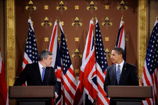 El primer ministro británico, Gordon Brown, habla con el Obama, durante una rueda de prensa mantenida al término de su reunión en Downing Street. (EFE)