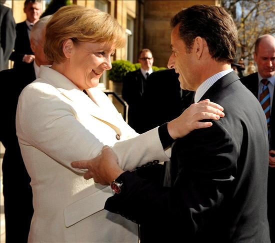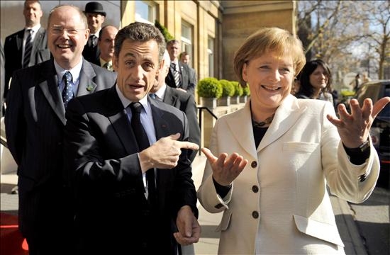 La canciller alemana Angela Merkel, y el presidente francés, Nicolás Sarkozy, se saludan antes de reunirse para afinar la estrategia que los dos países llevarán a la cumbre del G20 en Londres. (EFE)