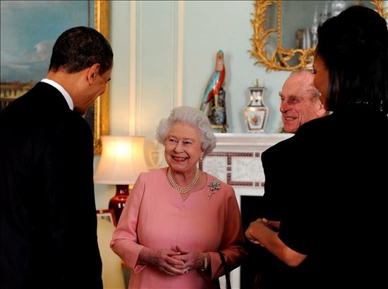 La reina Isabel II de Inglaterra y su esposo, el príncipe Felipe de Edimburgo, conversan con Barack Obama, y su mujer, Michelle, durante el encuentro privado que mantuvieron en Palacio de Buckingham. (EFE)
