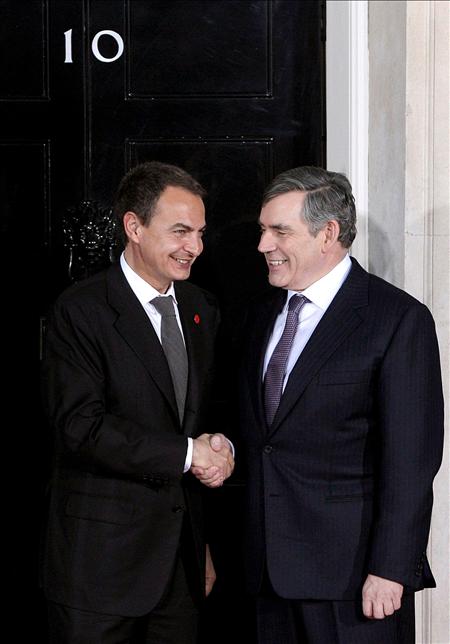 Zapatero saluda a Brown a su llegada a la residencia oficial de éste en Downing Street. (EFE)