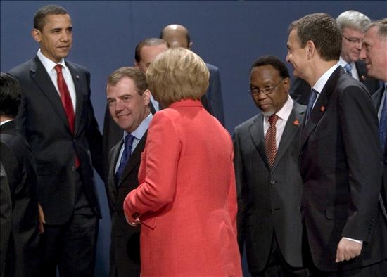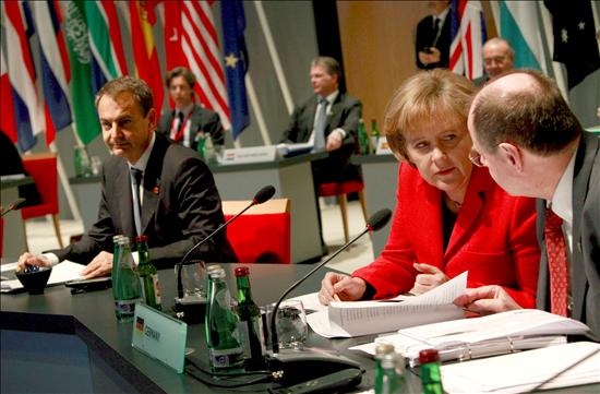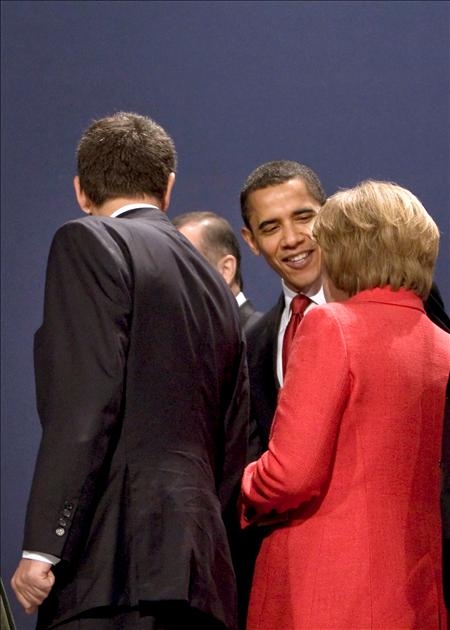 Merkel y Obama conversan. Zapatero no ha conseguido todavía la esperada foto junto al presidente de EEUU. (EFE)