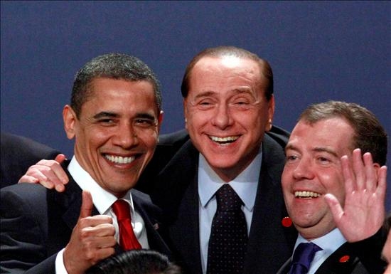 Barack Obama bromea con el primer ministro italiano Silvio Berlusconi y con el presidente ruso Dmitry Medvedev. (EFE)