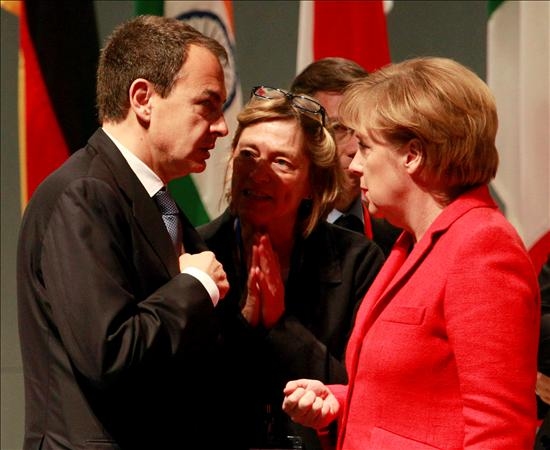 Zapatero necesita de la ayuda de una intérprete para poder comunicarse con los líderes europeos, en esta ocasión con Ángela Merkel. (EFE)