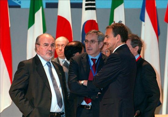 Zapatero sonriente y Solbes con gesto serio en la cumbre del G-20. (EFE)