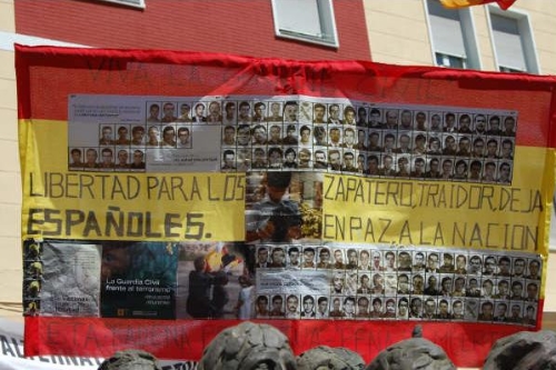 Varios asistentes al homenaje a los 25 asesinados por De Juana Chaos en la madrileña plaza República Dominicana sostienen una bandera española con rostros de víctimas del terrorismo. Foto: Sergio Ortega, lector LD.