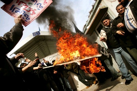 En muchos lugares del mudo islámico se vivieron violentas protestas por las caricaturas, generándose violentos enfrentamientos donde murieron 150 muertos. En la fotografía, varios hombres queman una bandera danesa en la franja de Gaza.