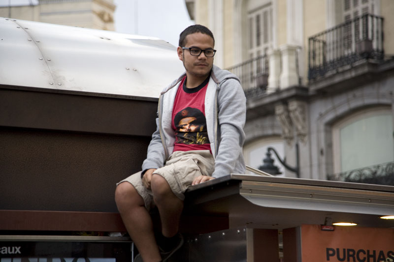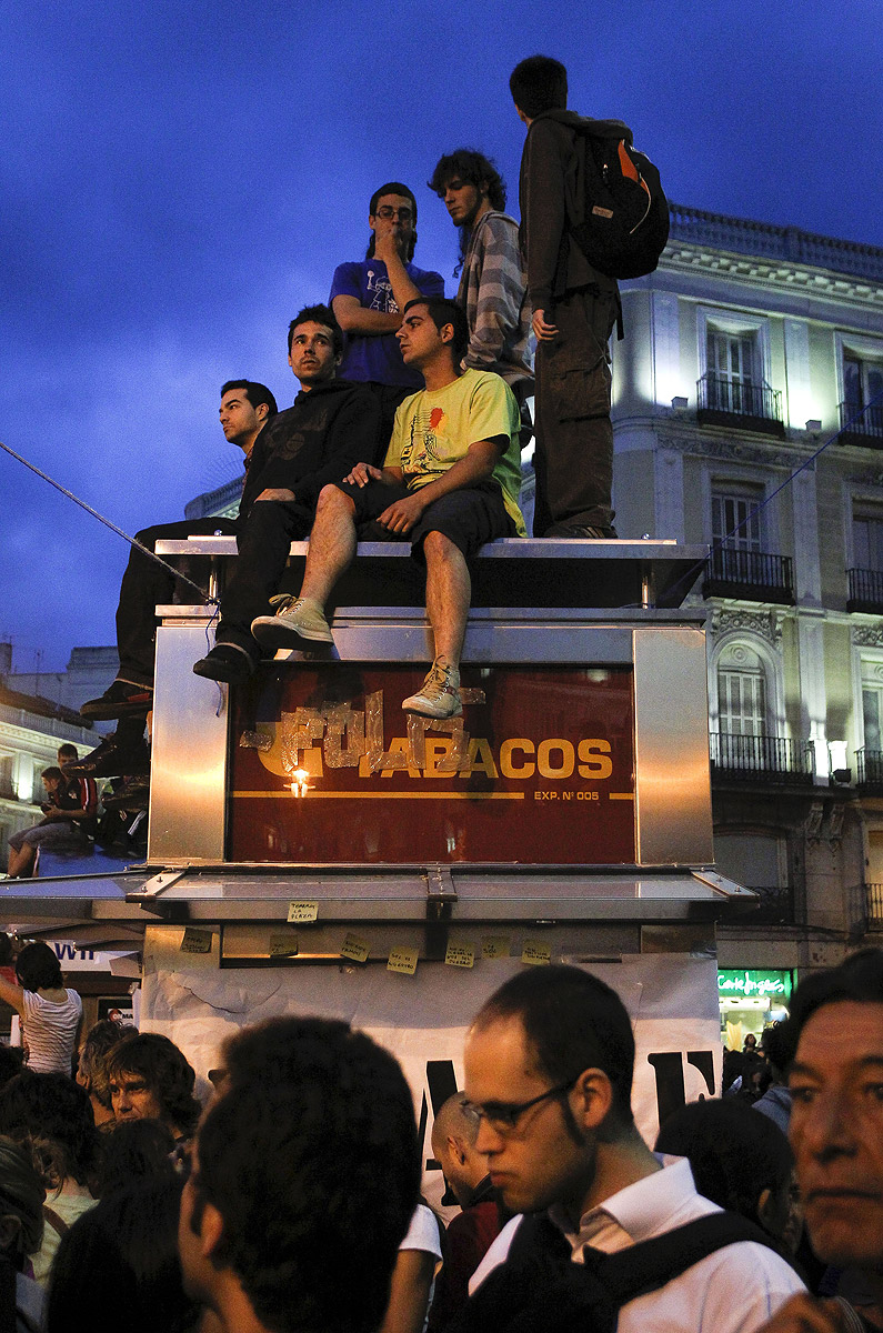 Tres jóvenes "indignados" encaramados sobre un quiosco asisten a la manifestación del miércoles. Dos de ellos se afanan para inmortalizar el momento, el tercero se lía lo que parece un cigarrillo.