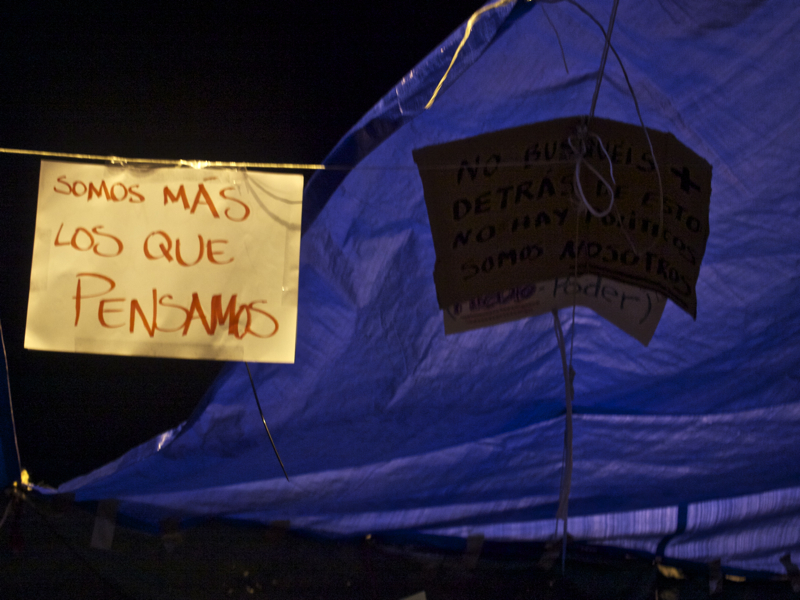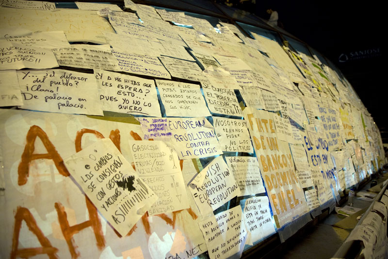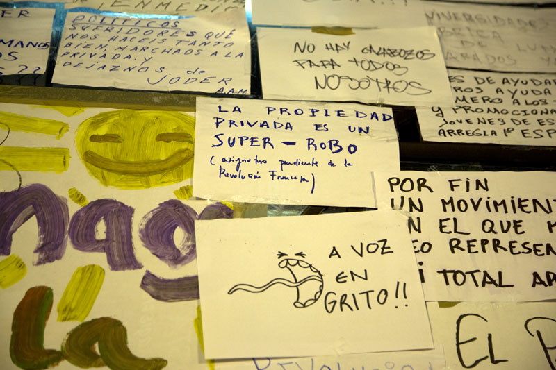 Algunos de los carteles colocados en la plaza por los 'indignados'.
