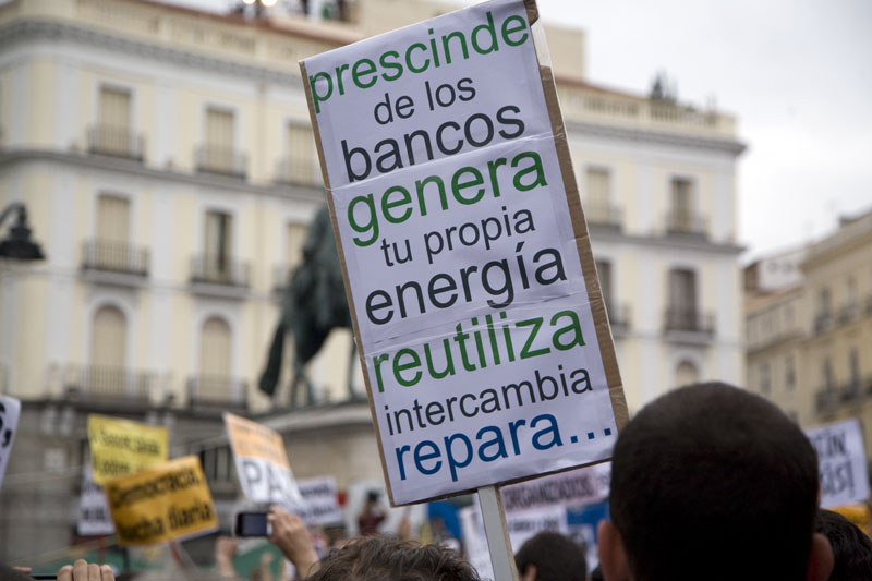 Este manifestante mezcla la banca con el sector energético... y tan pancho.