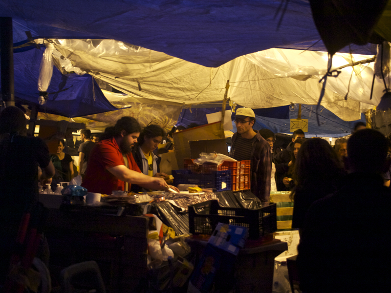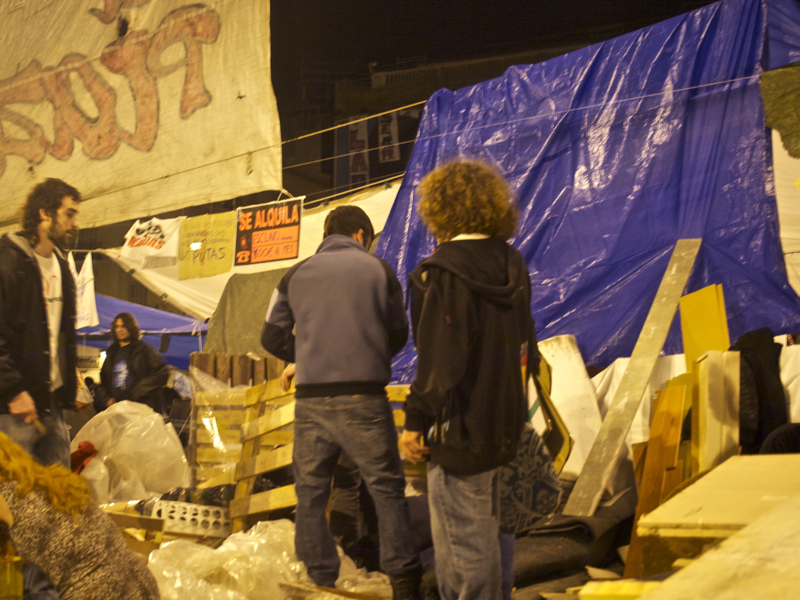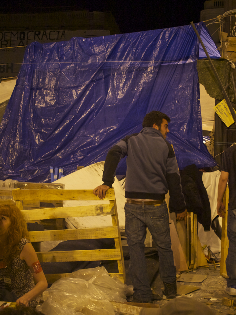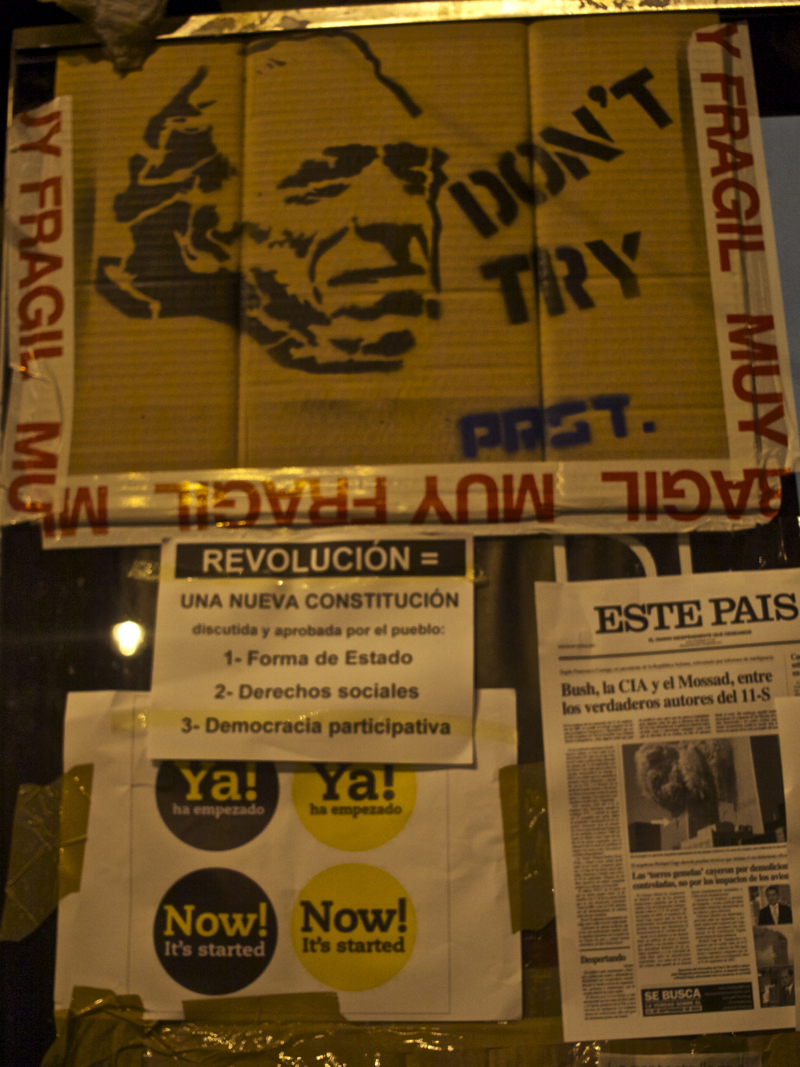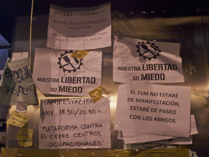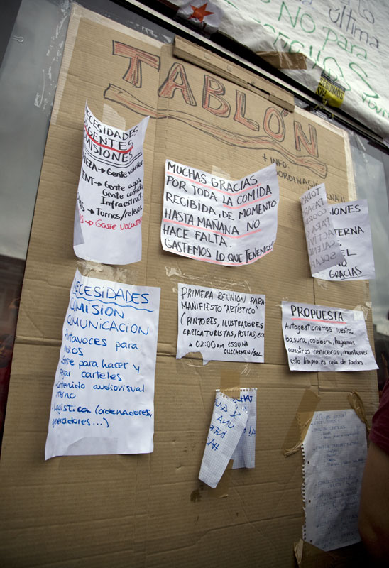 Muy al estilo de las casas okupadas, los "okupas" de la Puerta del Sol han colgado un tablón en uno de los quioscos.