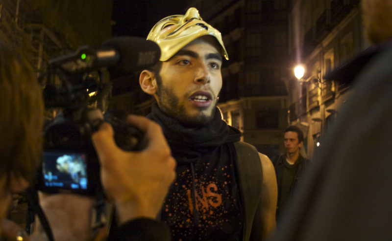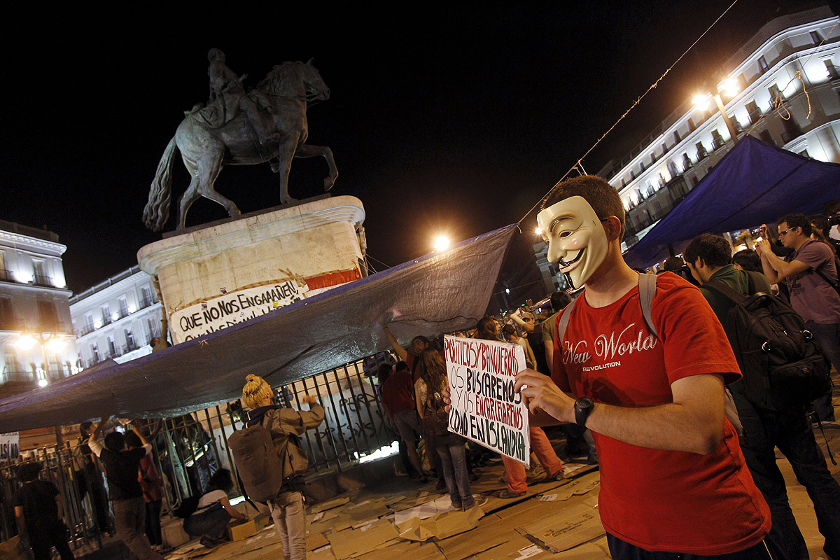 Un 'indignado' con una de las caretas de V de Vendetta en la Puerta del Sol.