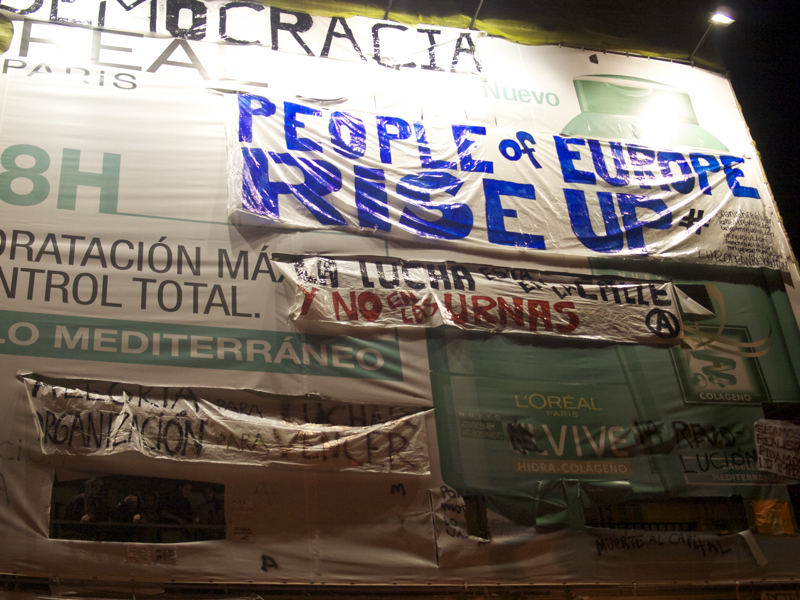 Pancartas colocadas sobre un cartel publicitario de la Puerta del Sol.