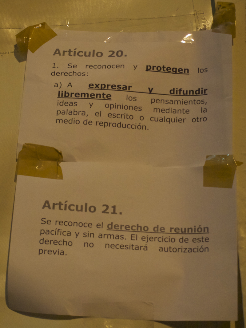 Dos carteles recogen los artículos 20 y 21 de la Constitución española.