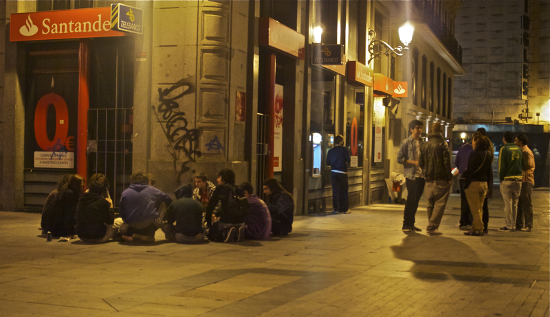 Algunos de los 'indignados' se reunen junto a una entidad bancaria.