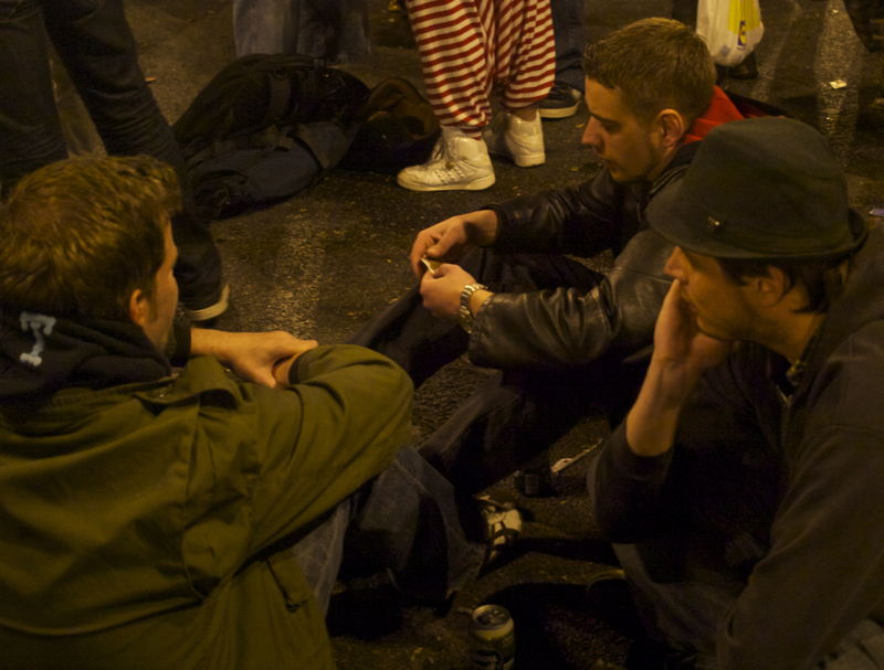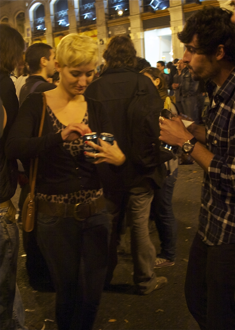 Cae la noche y comienza el botellón. Ambiente distendido, cervecero. El tiempo, esta noche, no acompaña tanto como la anterior.