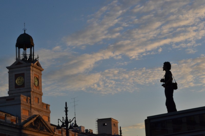 Uno de los muchos reporteros gráficos que cubren el acto, frente al reloj de la Casa de Correos.