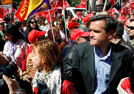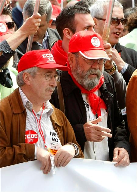 Los secretarios generales de CCOO y UGT, Ignacio Fernández Toxo (i) y Cándido Méndez, respectivamente, durante la manifestación convocada en Madrid por ambas centrales sindicales con motivo del primero de mayo y en defensa del empleo. (EFE/J.J. Guillén)