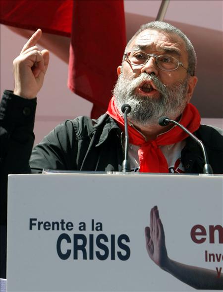 El secretario general de UGT, Cándido Méndez, durante su intervención en la manifestación convocada en Madrid conjuntamente con CCOO con motivo del primero de mayo. Méndez arremetió contra EEUU, Esperanza Aguirre, el PP, la derecha, el "neoliberalismo" y el capitalismo. En cambio, aplaudió la politícia del Ejecutivo. EFE/J.J. Guillén