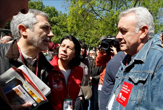El coordinador general de IU, Cayo Lara (d), charla con el diputado de Izquierda Unida Gaspar Llamazares, en presencia de la portavoz de IU en la Asamblea de Madrid, Inés Sabanés, durante la manifestación convocada en Madrid por UGT y CCOO con motivo del primero de mayo. (EFE/J.J. Guillén)
