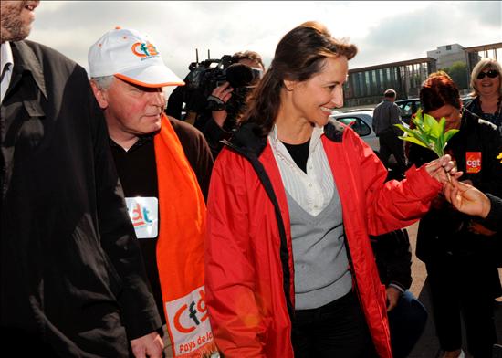 La dirigente socialista francesa, Ségolène Royal (d), participa en una manifestación convocada por los empleados de Heuliez con motivo del Día Internacional del Trabajo en Niort (Francia). (EFE/Caroline Blumberg)