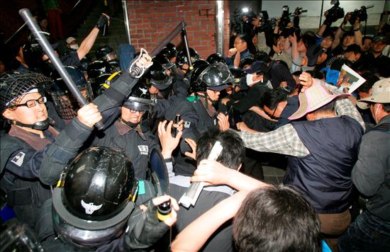 Manifestantes de la Confederación Surcoreana de Sindicatos se enfrentan a la policía durante una manifestación con motivo del Dia Internacional del Trabajo este viernes 1 de mayo de 2009 en Seúl, Corea del Sur. (EFE/CHO SUNG-BONG)