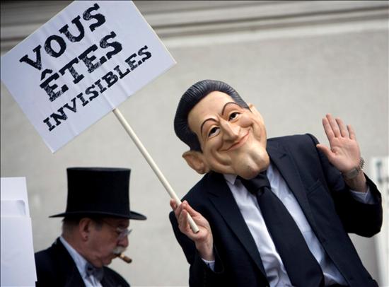 Un manifestante luce una máscara con el rostro del presidente francés, Nicolas Sarkozy, con una pancarta en la que se puede leer "Sois invisibles", durante la manifestación que se celebró en París, Francia, con motivo del Día Internacional del Trabajo, este viernes 1 de mayo. Francia es escenario además de unas 280 manifestaciones contra la política económica de Sarkozy y en la mayoría de las protestas, por primera vez en la historia, participan juntos los ocho grandes sindicatos del país. (EFE/Ian Langsdon)
