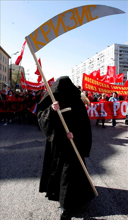 Un hombre caracterizado como la muerte participa junto a miles de personas en una manifestación en Moscú este viernes 1 de mayo de 2009 con motivo de la celebración del Primero de Mayo, el Dia Internacional del Trabajo. (EFE/MAXIM SHIPENKOV)