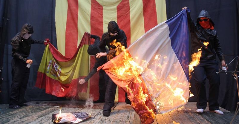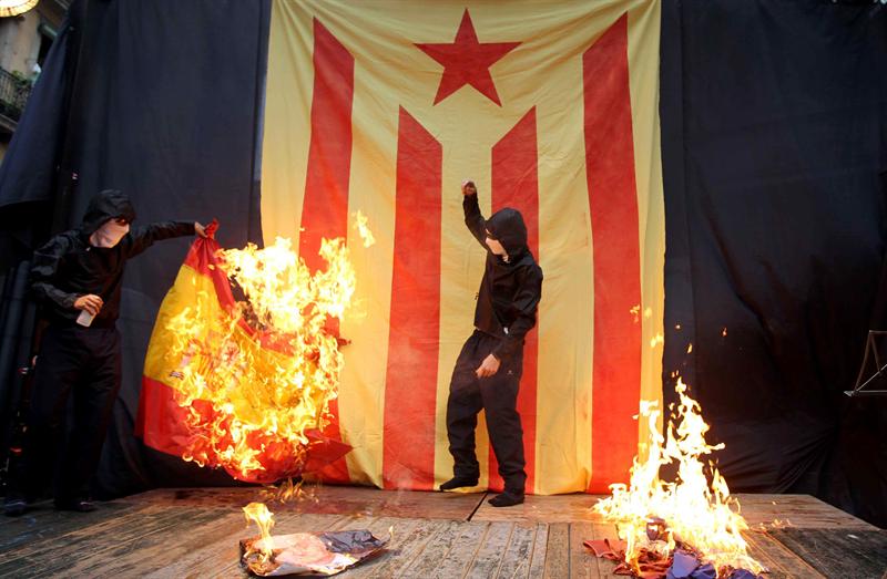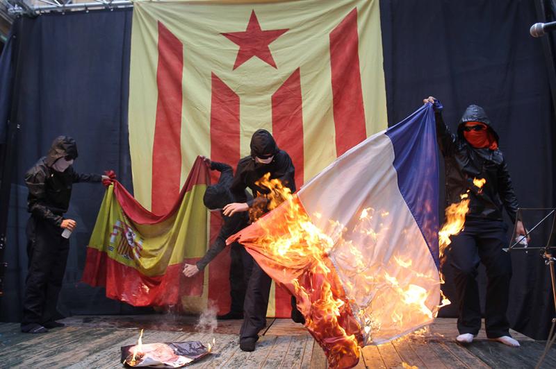 La manifestación independentista con motivo de la fiesta del Once de Septiembre ha terminado con la quema de banderas española y francesa y una foto del Rey.