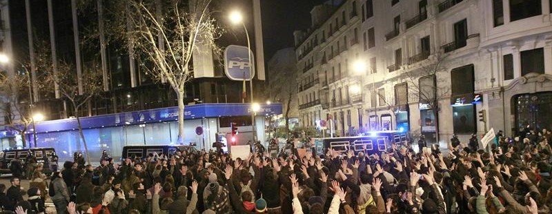 La sede del Partido Popular en Madrid ha sido sitiada por un grupo de manifestantes. Varios furgones de la Policía impedían el paso.