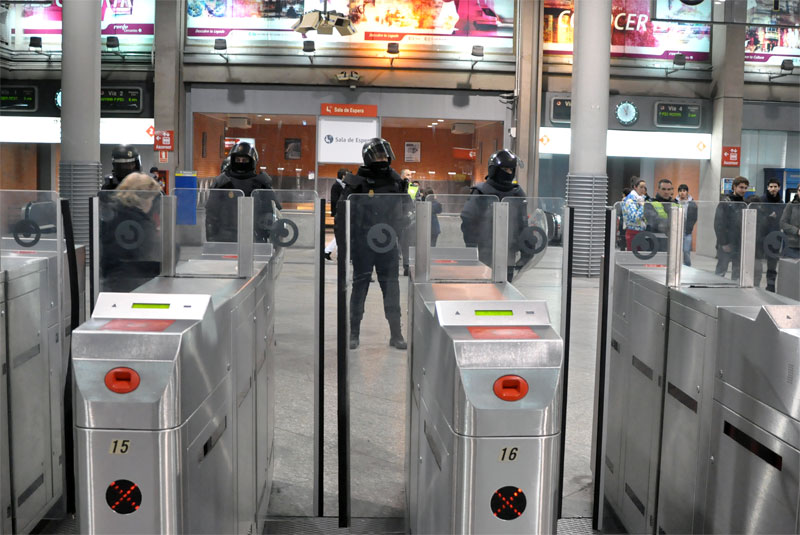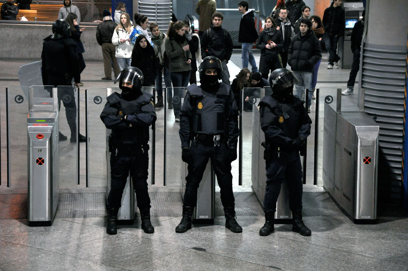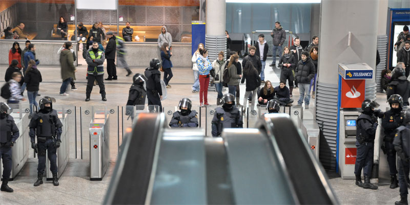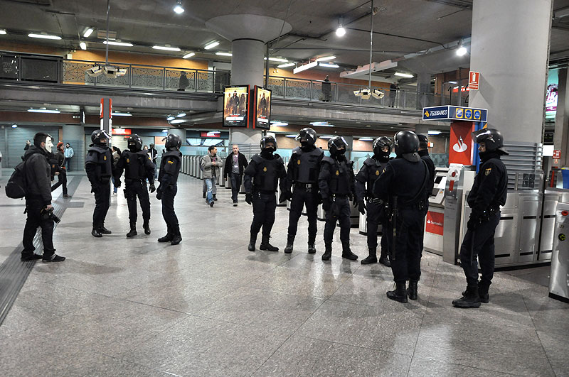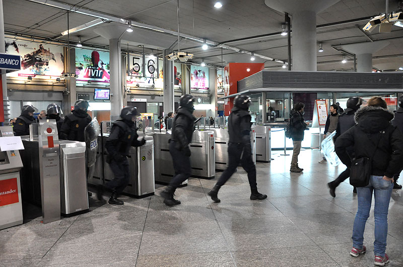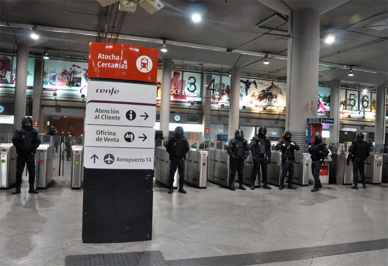 Varios antidisturbios vigilan la entrada al metro de Atocha.