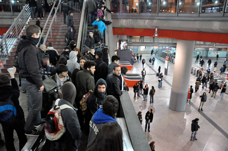 Los manifestantes más radicales mantenían la distancia sin bajar a la entrada al metro donde esperaba la Policía.