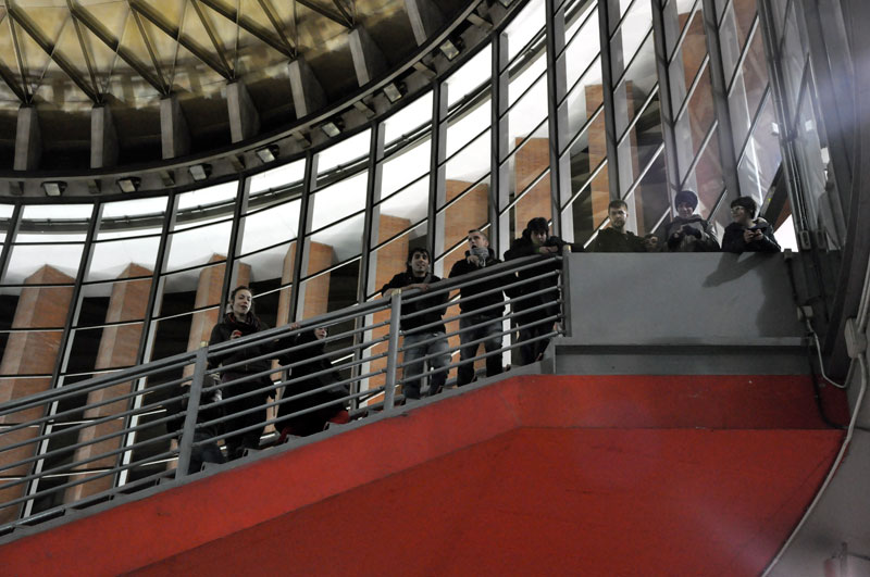 Algunos de los pocos que quedaban en el interior de la entrada a la estación de Atocha permanecían observando el transcurso de los acontecimientos.