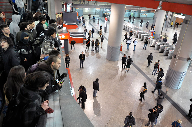 Los más radicales han increpado a la Policía desde la distancia en el primer piso de la estación.