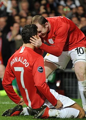 Wayne Rooney, en la imagen celebrando un gol con Cristiano Ronaldo, podría romper el récord de su ex compañero el próximo verano. El Manchester United necesita dinero y los tabloides ingleses lo tasan en 110 millones de euros.
