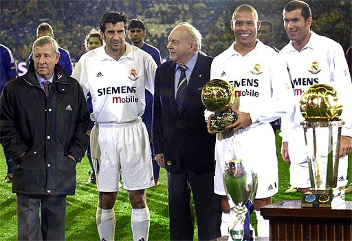Kopa, Figo, Di Stéfano, Ronaldo y Zidane, los cinco balones de oro del Real Madrid, reunidos en una foto histórica. Se dice que Bernabéu pagó 27.000 dólares (unos dos millones de pesetas) por los derechos de la Saeta Rubia. Zidane costó 75 millones de euros; Figo, 58; y Ronaldo 45.