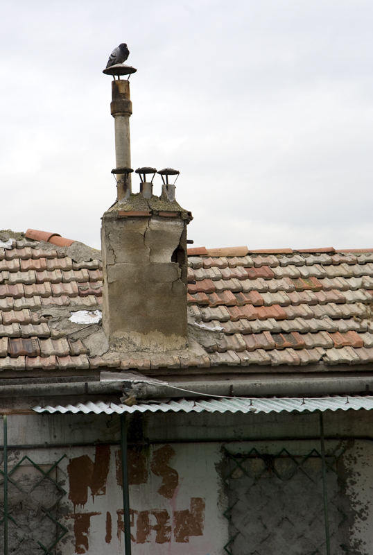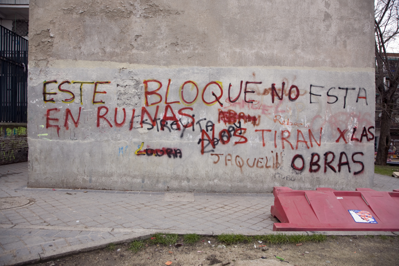 Una paloma se posa sobre la chimenea del edificio, bajo la cual los vecinos han pintado un graffiti con la leyenda: "Nos tiran"