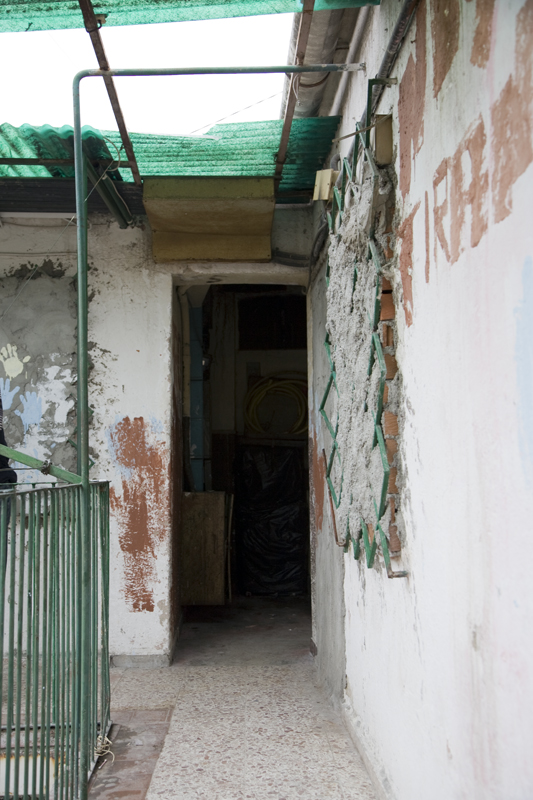 Puerta de la escalera del tercer piso que da al pasillo descubierto.