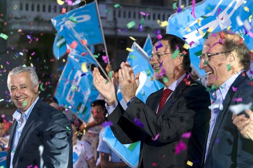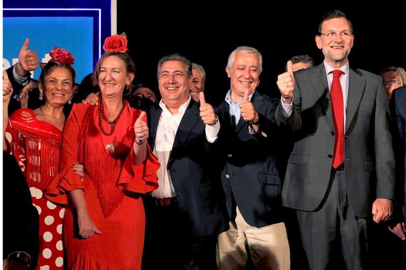 Rajoy, Arenas y Zoido estaban encantadas con las mujeres, vestidas de sevillanas, que les acompañaron en el arranque de la campaña.