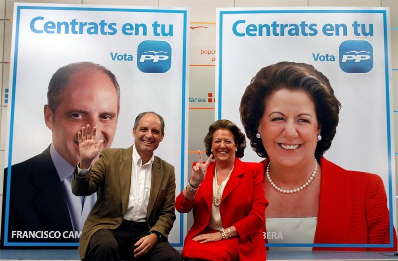 Enormes carteles flanqueaban a unos sonrientes Camps y Barberá, que parecían emular en su posado a sus gestos en la propaganda del partido.