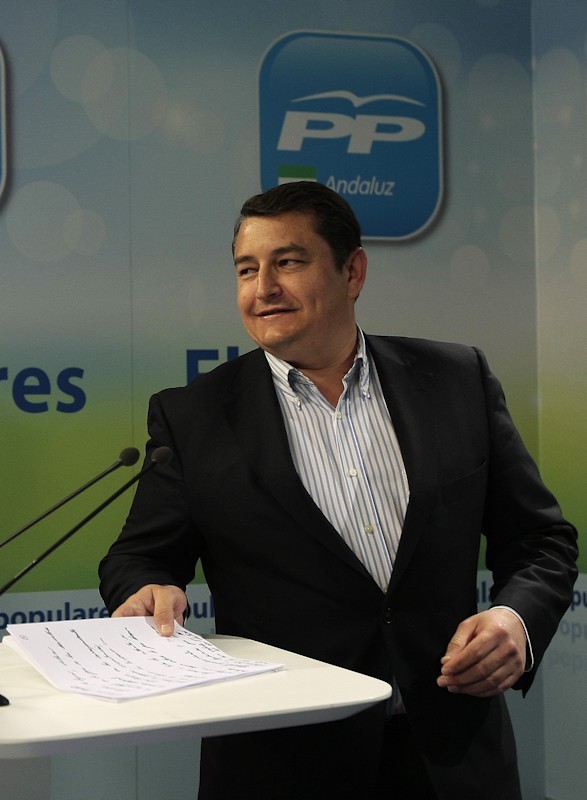 Arenas y los dirigentes del PP saludan a los militantes congregados en la sede del PP de Sevilla.
