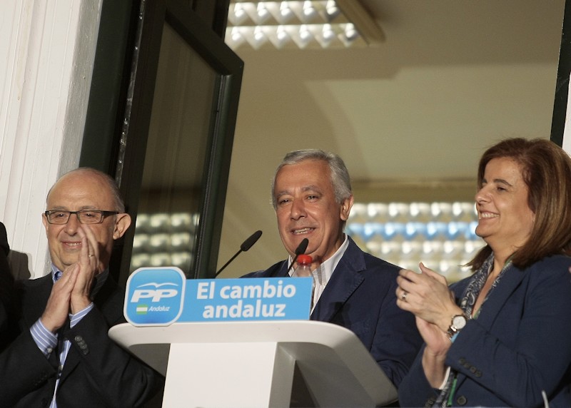 Javier Arenas, Cristóbal Montoro y Fátima Báñez en el balcón de la sede del PP en Sevilla.