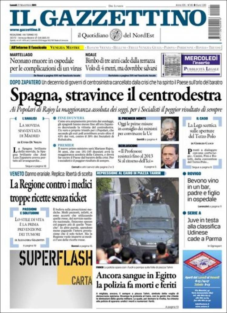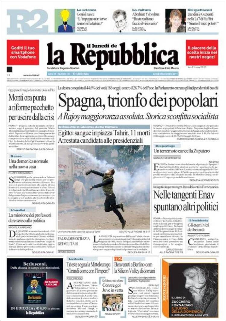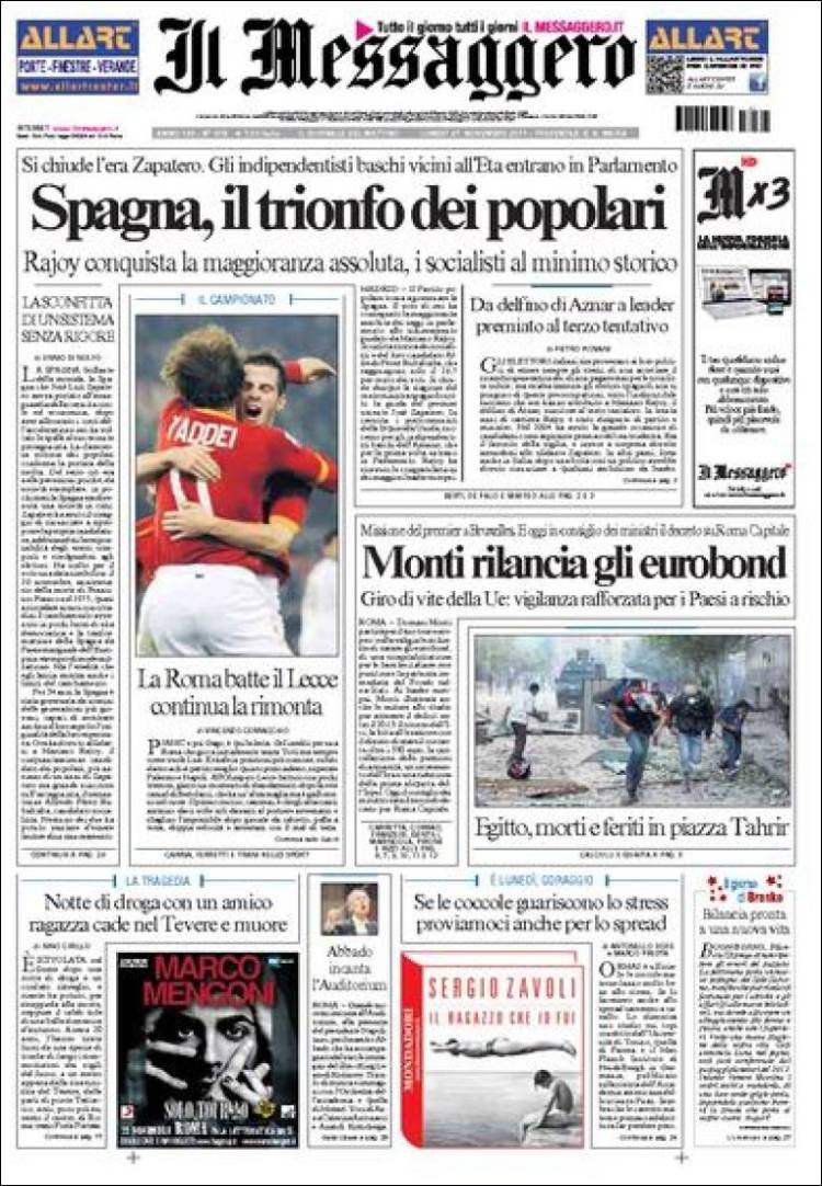 Este diario italiano abre su portada con "España, el triunfo de los populares". También dice que "Rajoy conquista la mayoría absoluta, y los socialistas el mínimo histórico".