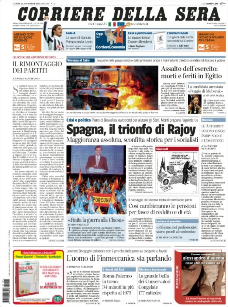 Este diario italiano titula: "España, el triunfo de Rajoy". También destacan la mayoría absoluta del PP y la derrota "histórica" de los socialistas.